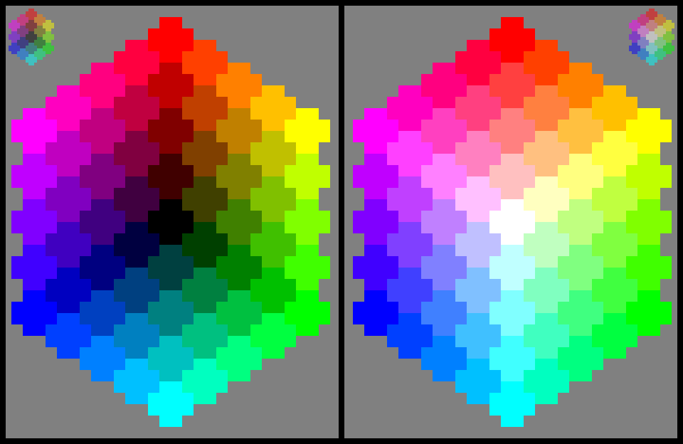 RGB color space is a cube. the eight corners of the cube are [black], white, red, yellow, lime (light green), cyan, blue, and fuchsia.